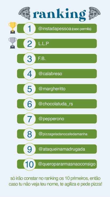 A partir de cada início de mês, o ranking será resetado e os dois vencedores do mês anterior serão anunciados (caso aceitem a "exposição") em nosso instagram, ou serão somente comunicados no whatsapp.